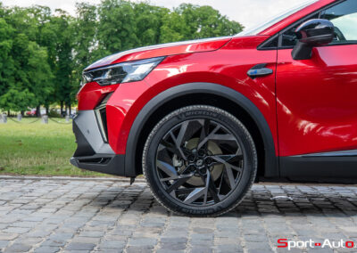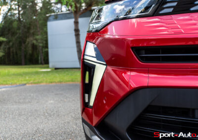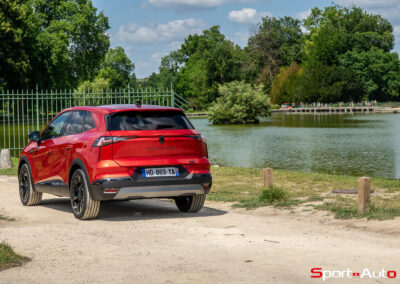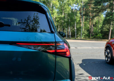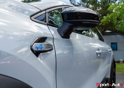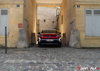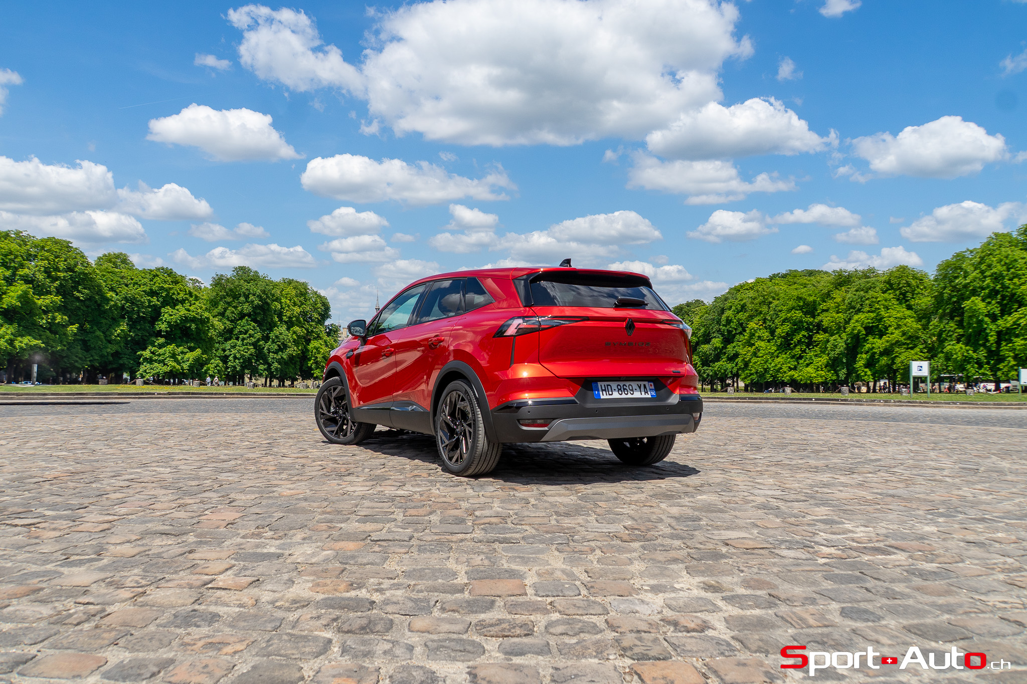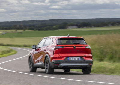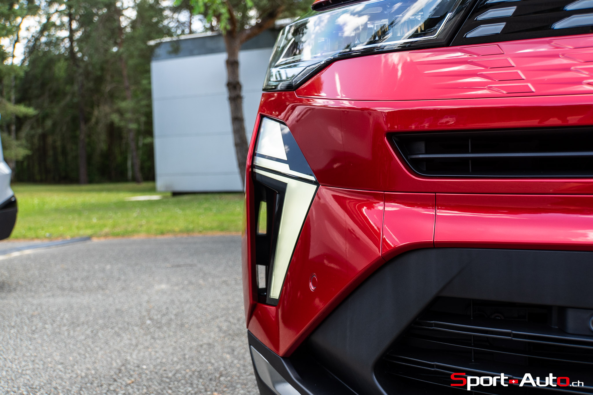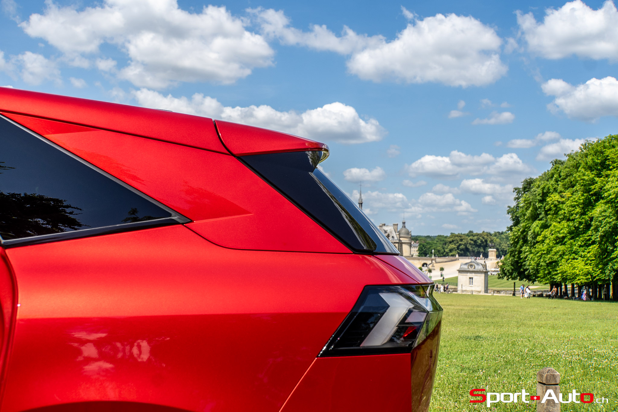Le design extérieur est soigné, avec notamment des demi-losanges intégrés aux LED des phares inférieurs à l’avant. Élégamment intégré à ceux-ci, on retrouve un passage redirigeant l’air vers les roues. Notre exemplaire en teinte Rouge Flamme (de série) est chaussé de jantes 19 pouces “Alpine Elixir“ qui lui confèrent une allure agréable. À l’arrière, une nouvelle signature lumineuse affinée apporte une touche de sophistication bienvenue.