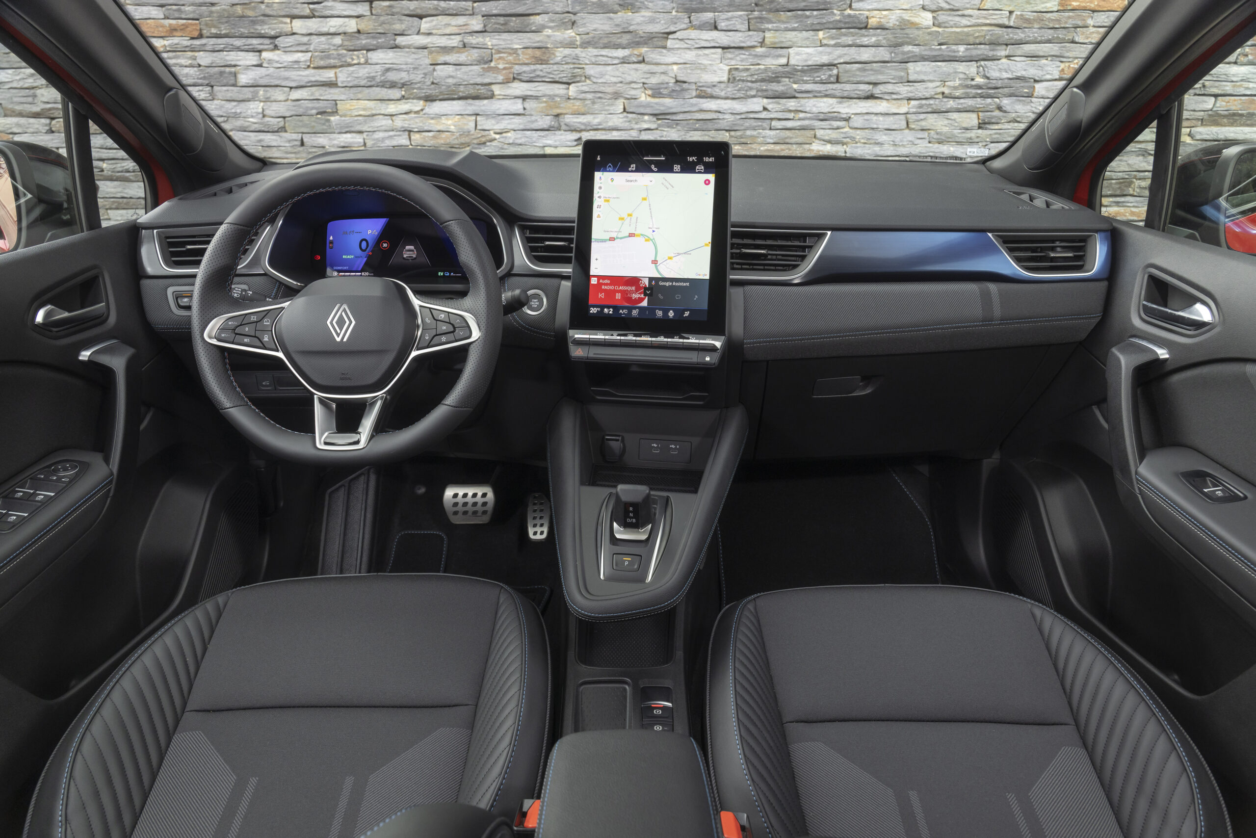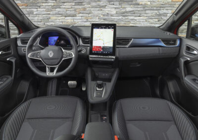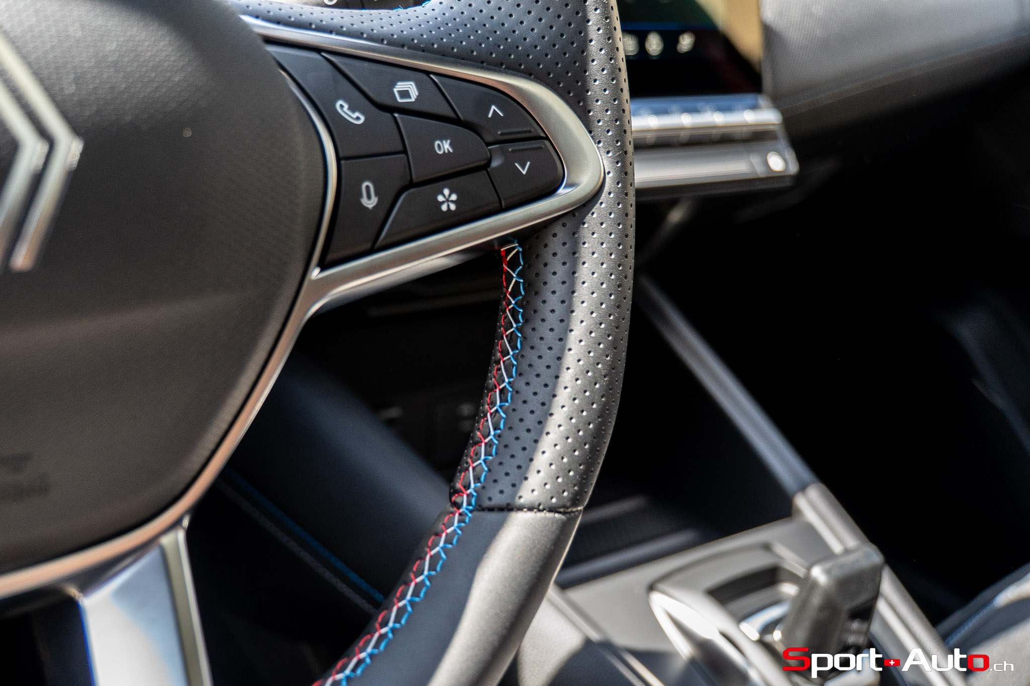 L’intérieur de notre Symbioz est illuminé par le toit en verre panoramique opacifiant Solarbay® (en option à CHF 1500.-), dont le fonctionnement rappelle celui de la Maserati MC20 Cielo que nous avons essayée récemment : le vitrage passe du transparent à l’opacifié en un instant. Notre version Esprit Alpine reçoit des coutures bleu-blanc-rouge sur les sièges et le volant, ainsi qu’un logo Alpine discrètement apposé sur les dossiers avant. Contrairement à ses concurrentes de Peugeot notamment, la présentation du tableau de bord est conventionnelle. L’agencement est fonctionnel et agrémenté de boutons physiques utiles. Tout comme la Renault Austral, on retrouve un écran vertical au centre. Lisible et facile à prendre en main, il fonctionne sous OpenR Link, avec un système de navigation géré par Google Maps (de série). Au niveau du système audio, vous pouvez cocher l’option Harman Kardon (CHF 700.-) pour gratifier vos oreilles de vos musiques préférées durant vos trajets.