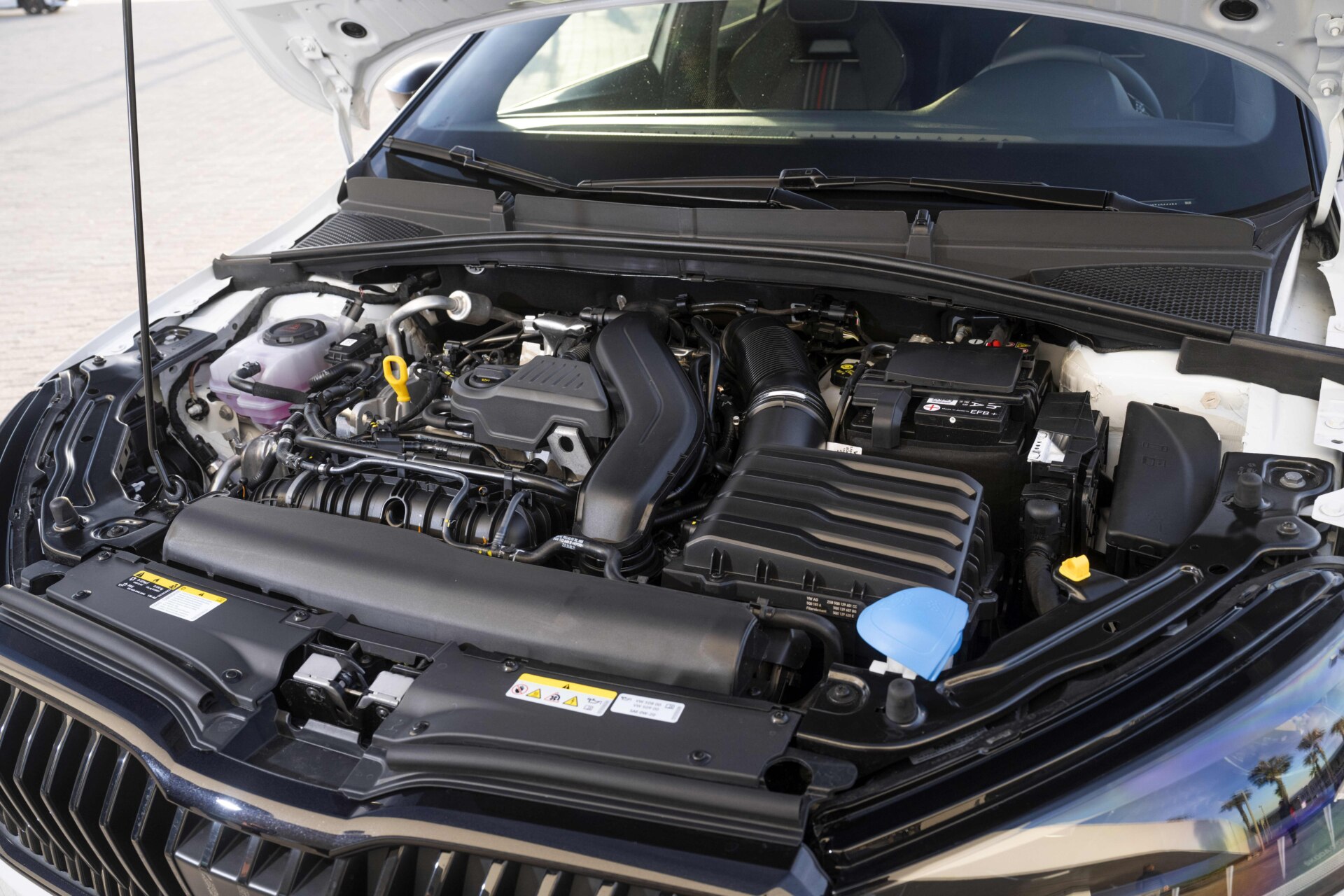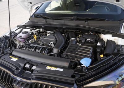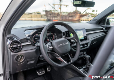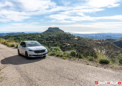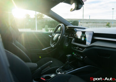 Cap désormais vers les collines derrière Valence, pour trouver quelques kilomètres de routes sinueuses. Sous son capot nervuré, la Fabia 130 est équipée du moteur 1.5 TSI EVO2 (version EA211), dont Skoda a été responsable du développement. Il est associé à une boîte DSG7, qui gère un lissage de couple entre les rapports lors des accélérations. Les 7 vitesses s’enchaînent sans broncher lors des accélérations. En revanche, une légère latence se fait parfois sentir lors des relances entre les rapports (2 et 3 notamment). Les ingénieurs tchèques m’ont confirmé que la présence d’une boîte à vitesse manuelle n’a pas été prévue, notamment à cause d’une « faible demande des clients », selon leurs dires.