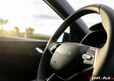 D’une manière similaire à la Cupra Formentor VZ5 BAT que nous avions essayé, la Skoda Fabia 130 révèle surtout son augmentation de puissance haut dans les tours. Le couple de 250 Nm est déjà disponible entre 1500 et 4000 tr/min, mais la puissance maximale est atteinte entre 5750 et 6000 trs/min. En mode Sport, on sent que la boite incite le conducteur à utiliser les hauts régimes. Le rugissement du petit moteur 1.5 TSI est très distinctif.