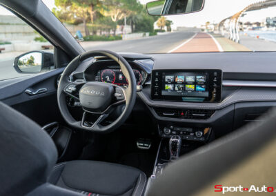 En se glissant à l’intérieur, on est accueillis par des sièges en tissu avec bandes centrales à l’aspect sportif. Tout comme l’extérieur, la Fabia 130 joue sur de subtils détails différentiateurs pour se démarquer de la version Monte Carlo : de nouvelles finitions au look carbone et des quelques détails en aluminium (pédales par exemple) garnissent l’habitacle. Derrière le volant sport à 3 branches, on retrouve un Virtual Cockpit de 10 pouces, fourni de série. L’écran central de 9 pouces permet l’intégration Apple Carplay ou Android Auto.
