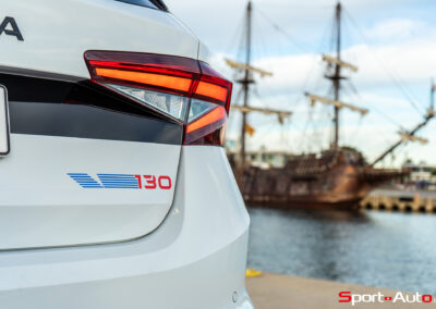 Les changements concernent aussi l’extérieur, mais d’une manière moins flagrante, avec des détails dynamisant l’apparence de cette petite compacte (4.11m de long et 1.78m de large). On retrouve notamment des contours de calandre assombris, des phares bi-led noirs et de nouvelles jantes 18 pouces Libra avec étriers de freins rouges. A l’arrière, une bande noire longitudinale entre les phares Leds rappelle celle des Fabia Rally 2 et offre un bel effet. La Fabia 130 reçoit également des embouts d’échappements doubles et badges latéraux spécifiques.