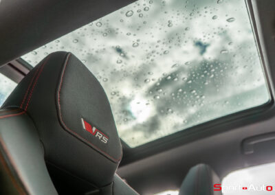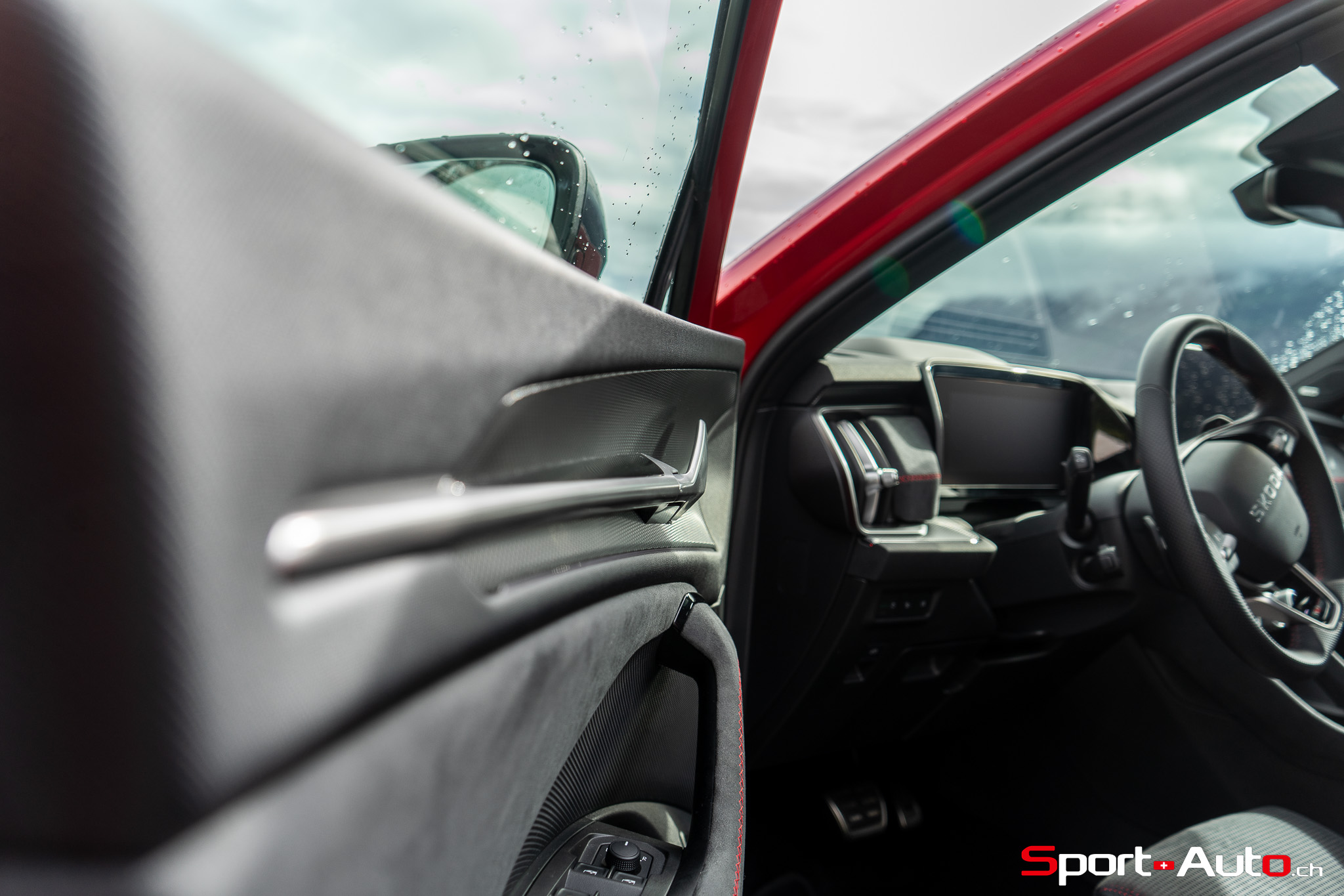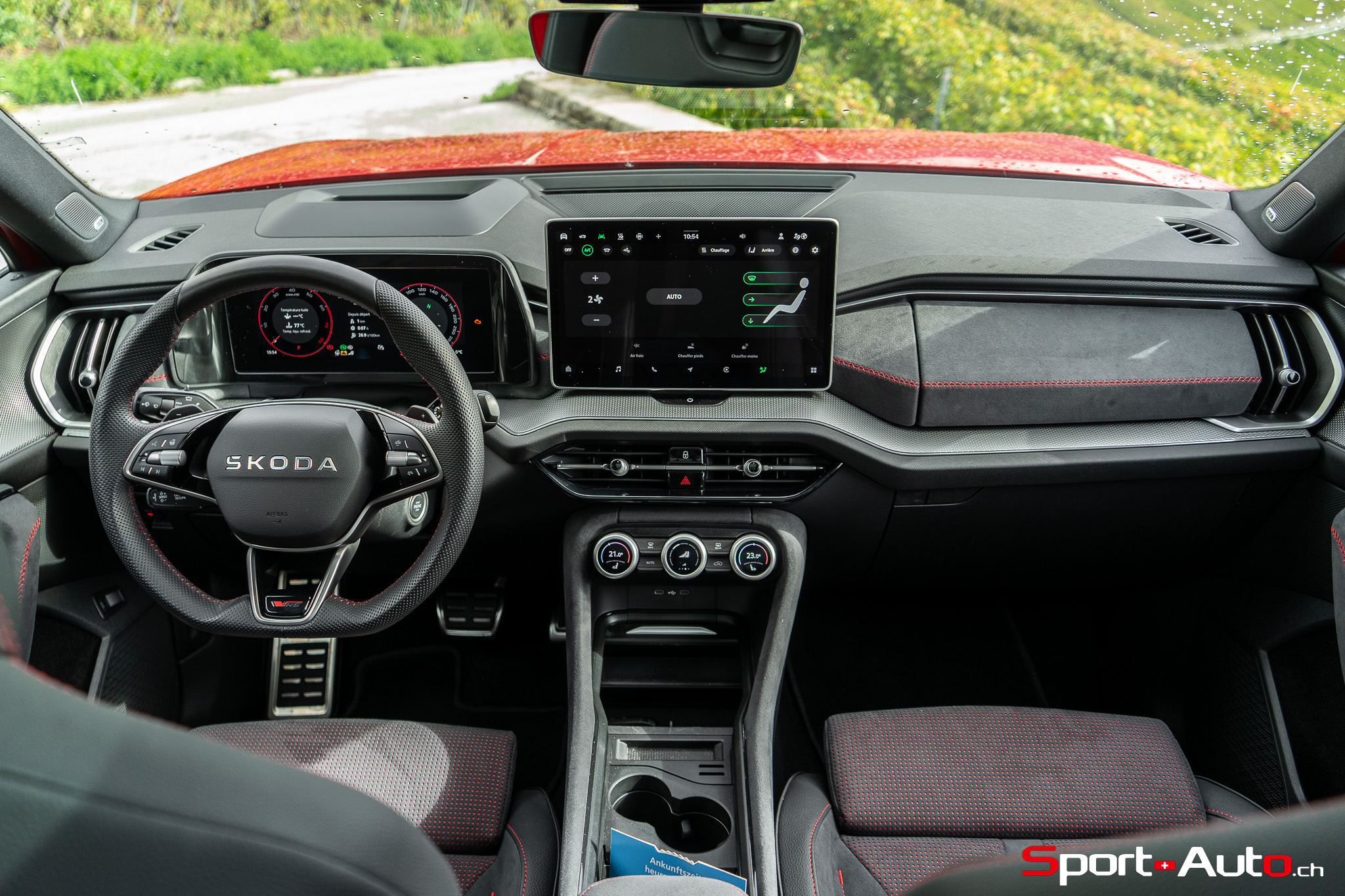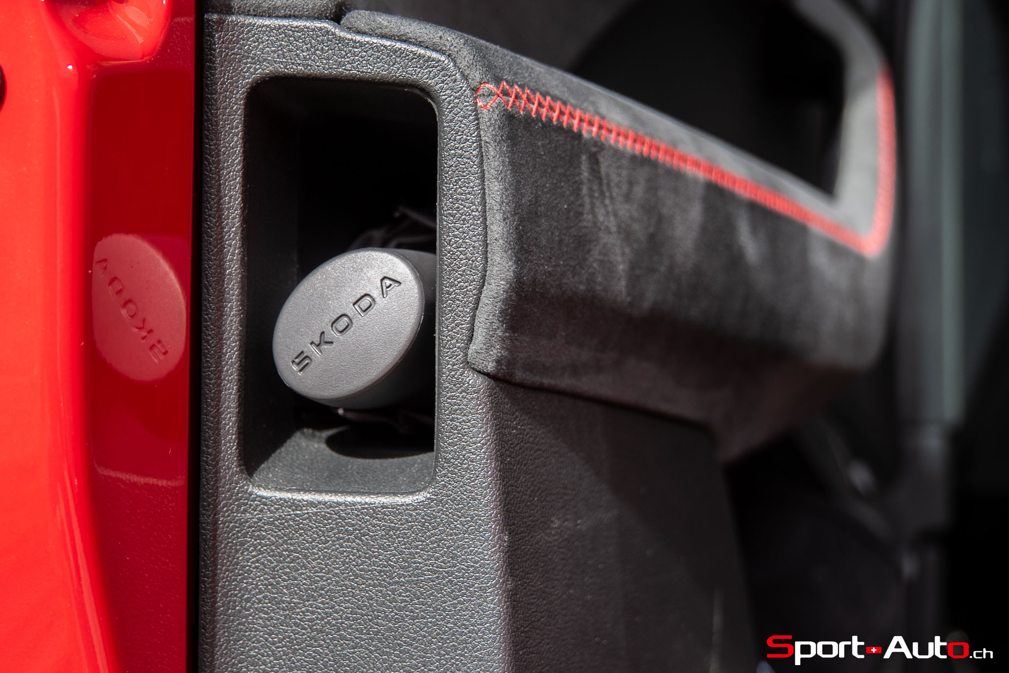 En pénétrant dans l’habitacle, les matériaux paraissent surprenants par leur aspect qualitatif. Le tableau de bord est garni d’un revêtement souple valorisant. A l’œil, les molettes de commandes centrales paraissent en aluminium… mais au toucher ce n’est pas le cas, c’est bien un matériel en plastique qui les recouvre. Quelques autres plastiques durs viennent souligner que l’aspect premium n’atteint donc pas le degré de raffinement de la Skoda Superb L&K que nous avions essayé en début d’année. Les sièges sportifs aux détails rouges (en Design Selection RS Suedia et similicuir) permettent de se rendre compte que nous sommes dans une version RS. Le toit ouvrant panoramique (CHF 1580.-) apport une luminosité bienvenue à ce grand habitacle. Fidèle à sa philosophie “Simply Clever“, la marque tchèque a pensé à plein de détails pratiques dans le Kodiaq, dont un parapluie intégré dans le panneau de porte, à la façon Rolls-Royce. D’autres caractéristiques comme le chargeur à induction, les multiples rangements et protections de portes sont présentes en équipement standard.