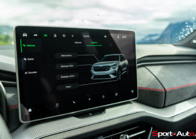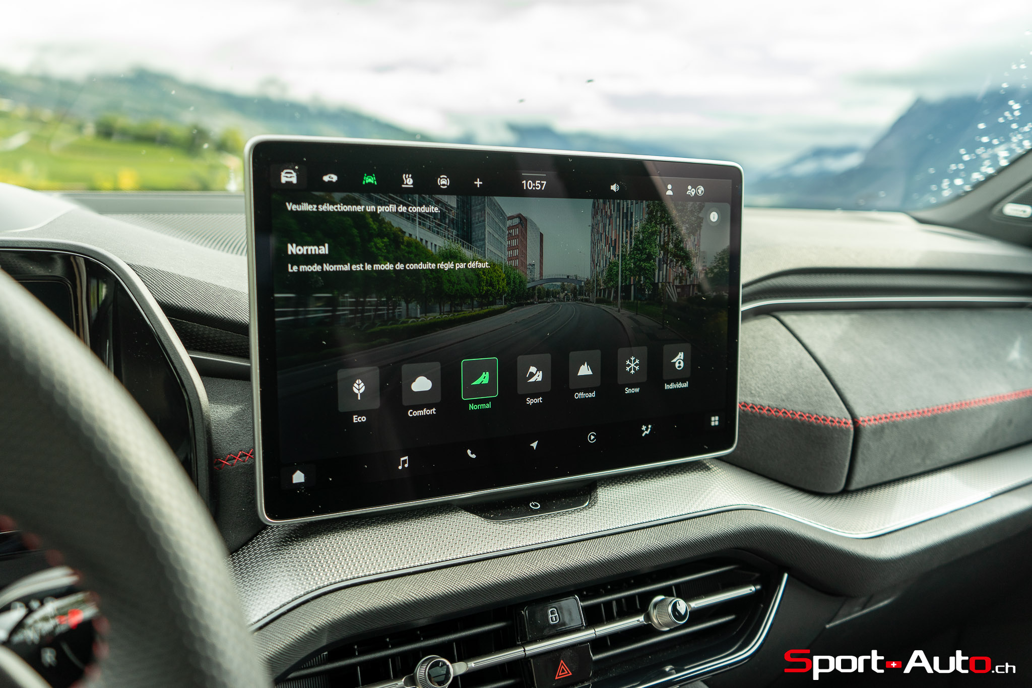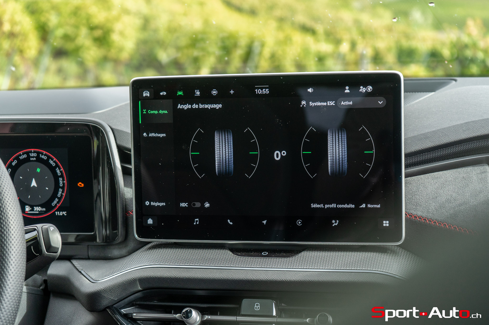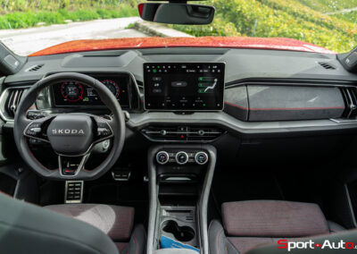 Le Kodiaq RS est équipé du Digital Cockpit Plus de 10 pouces avec écran d’info-divertissement de 13 pouces. On apprécie la possibilité de choisir la fonction de ce que la deuxième des trois molettes du centre affichera. Je choisis de mettre en avant la sélection des modes de conduite afin d’avoir la possibilité de les changer rapidement d’un geste, plutôt que devoir passer par l’écran. Le Kodiaq RS se veut être un véhicule polyvalent, et on le voit à travers ses multiples modalités disponibles : Eco, Comfort, Normal, Sport, Snow, et Offroad. Ce dernier reçoit un “hill holder” qui, dans les pentes raides en descente de notre essai, est particulièrement efficace et rassurant.