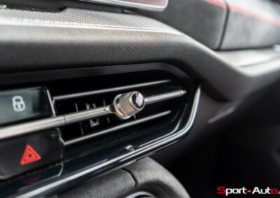 Le volant propose un toucher de couronne particulièrement agréable, similaire à une Audi RS3 par exemple. Le sélecteur de vitesse placé à droite du volant surcharge légèrement celui de gauche, qui hérite de la commande des essuie-glaces. Il permet cependant de libérer le tunnel central, qui dispose de grands et profonds rangements.