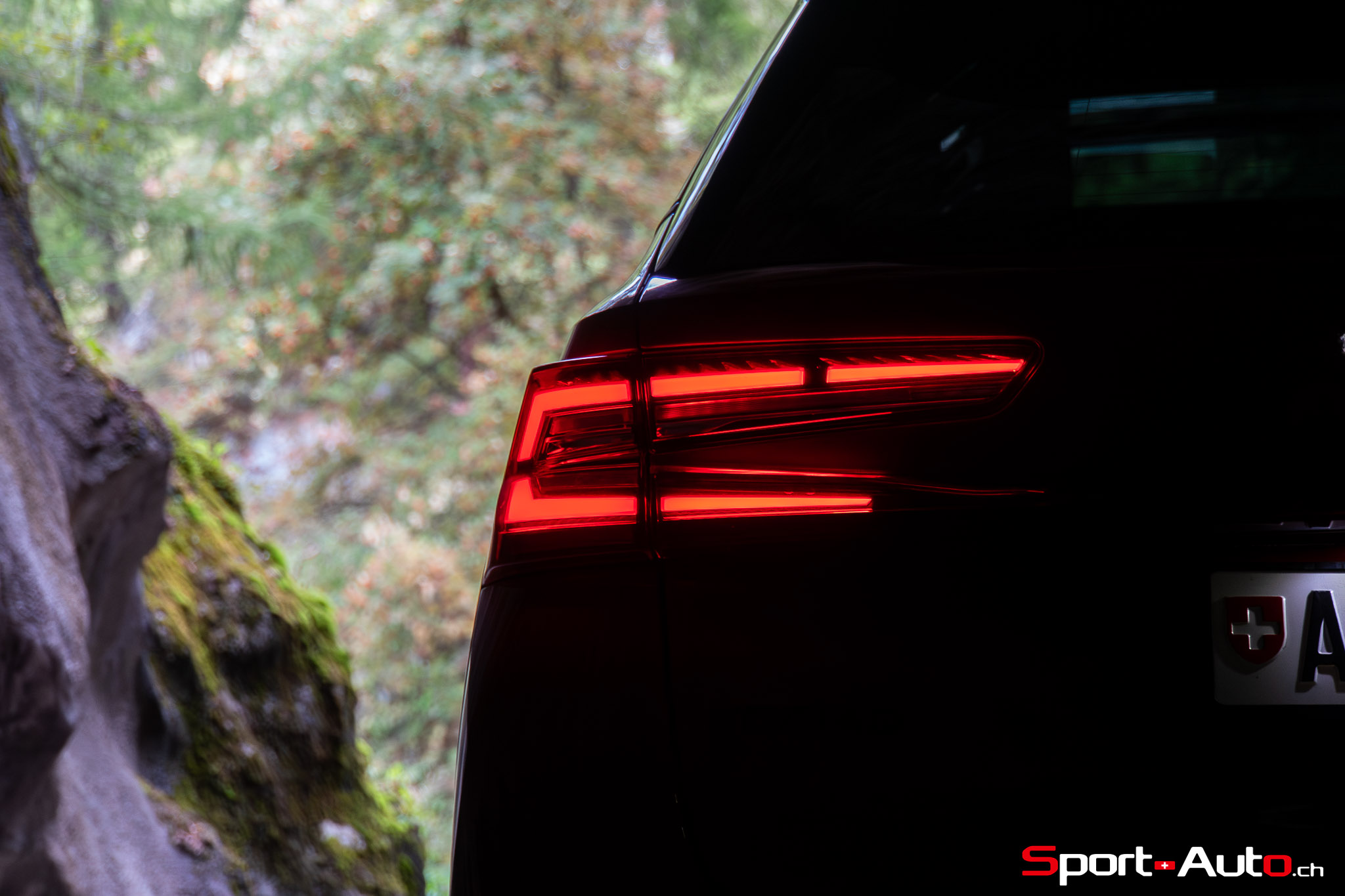 A l’extérieur, ce nouveau Kodiaq RS se distingue par de nouveaux pare-chocs, redessinés, parés de finitions en noir brillant faisant contraste avec la peinture “Velvet Red” de notre modèle d’essai (CHF 1490.-). Chaque grille de la face avant est fonctionnelle, y-compris les encoches latérales qui font office de (vrais) canaux d’air vers les roues. Des LEDs sont discrètement intégrées dans la calandre et prolongent la signature lumineuse horizontale des phares avant. Des nouvelles jantes alliage “Elias” de 20 pouces (235/45 R20) soulignent la posture musclée du SUV, et constituent la seule configuration disponible. Un nouveau dessin des phares donne un air épuré à la partie arrière. Cependant, le Kodiaq RS n’en demeure pas moins massif et puissant, à l’image de l’ours dont il tire son nom.