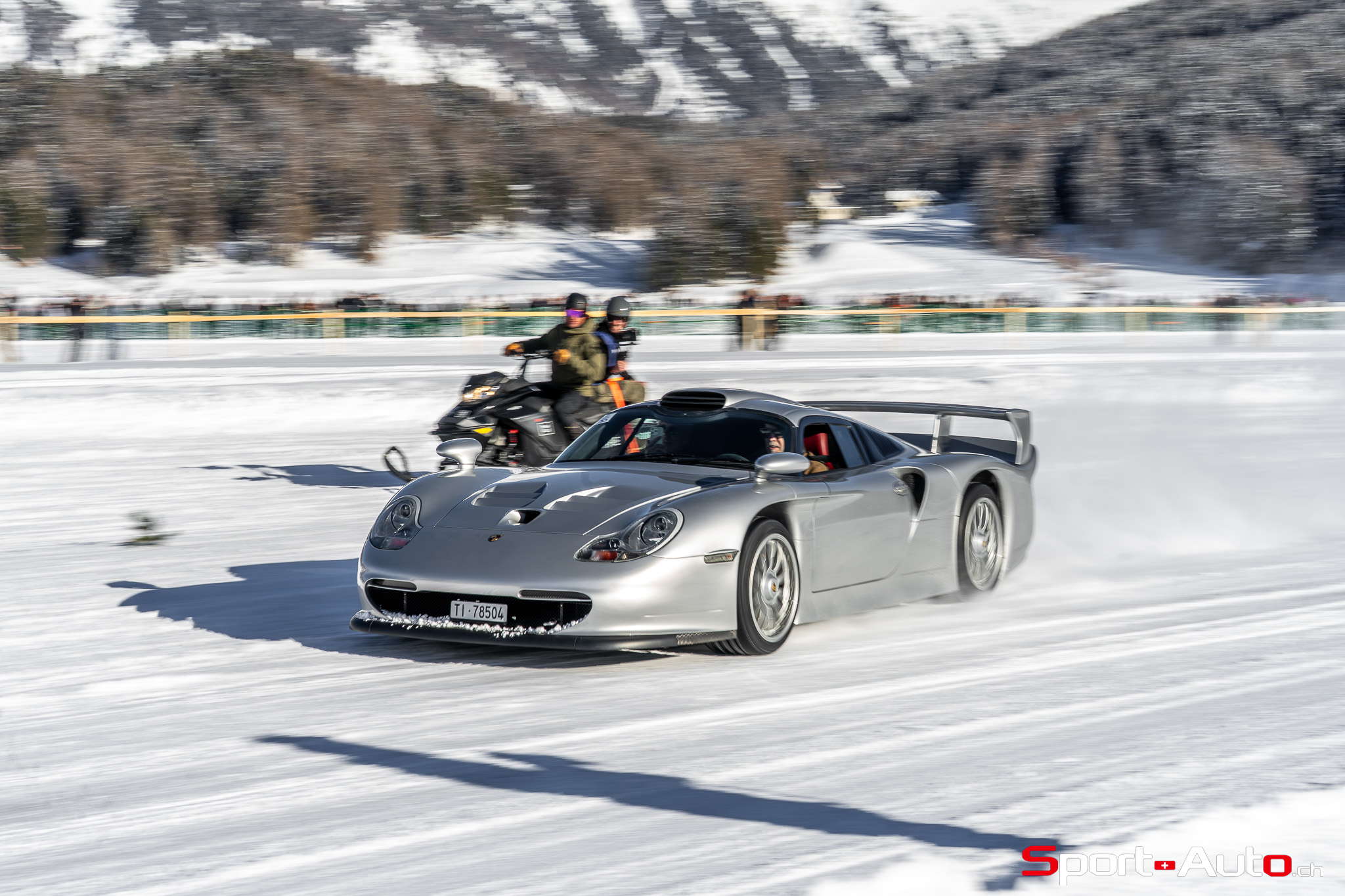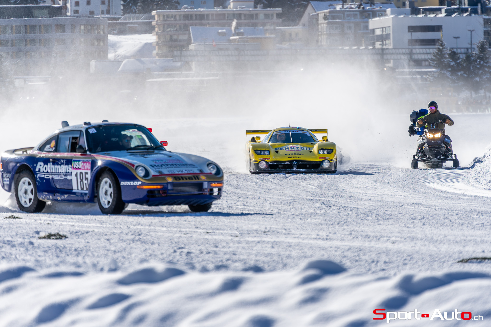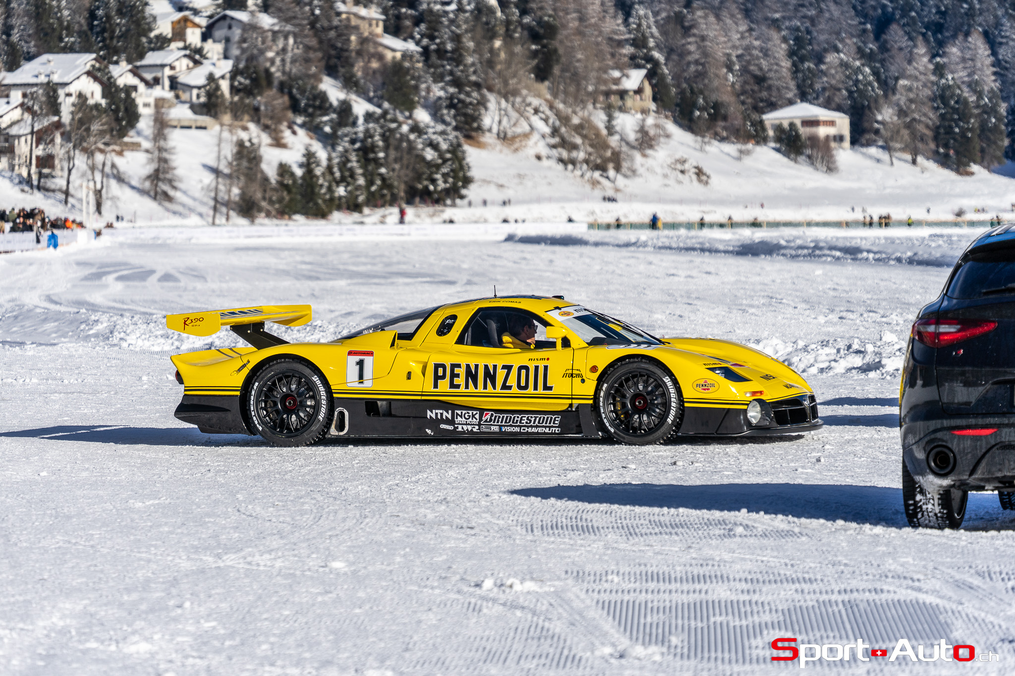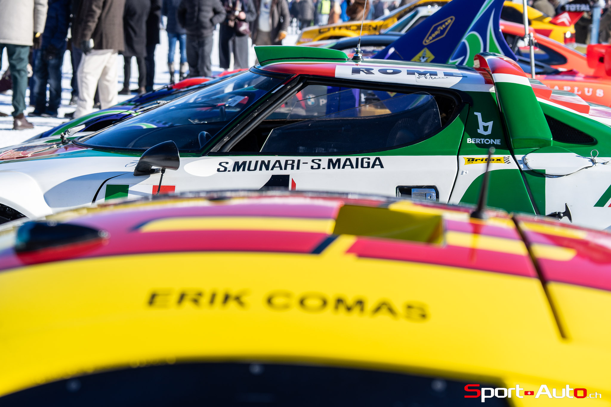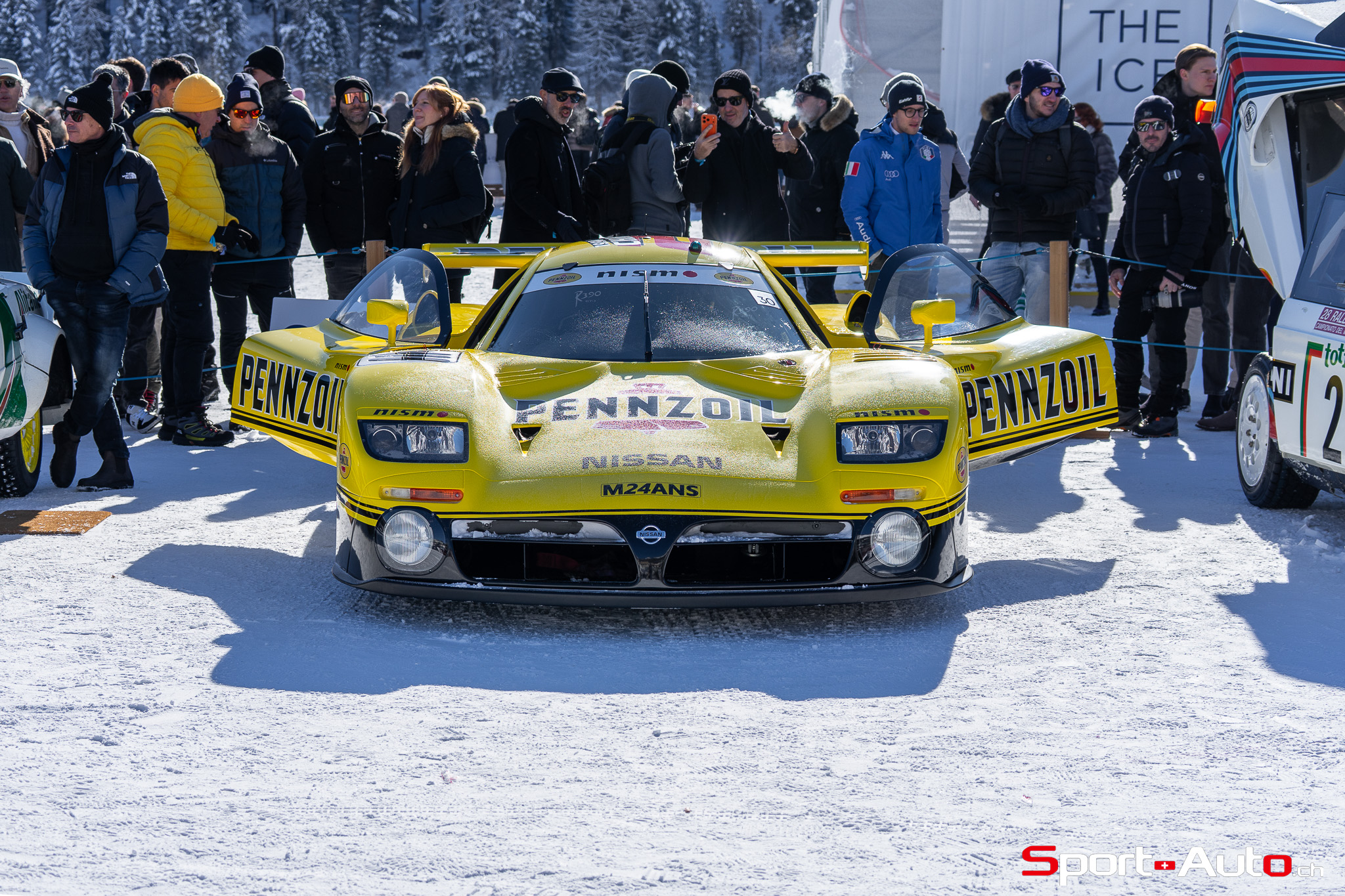 On a également eu la bonne surprise de retrouver l’ancien pilote de F1, Erik Comas, que nous avions déjà rencontré à Imola l’été passé à l’occasion d’Imola Classic. Sa Nissan R390 GT-1 qui a couru en 1998 au Mans dispose à présent d’une magnifique livrée Pennzoil. Nous l’avions observée à l’occasion du Concours d’Elégance de Villa d’Este en 2022, avec sa précédente livrée blanche. Comme si cette voiture n’était pas assez extraordinaire en soi, sachez qu’elle est… homologuée pour la route ! En effet, Erik Comas a rejoint St Moritz à son volant, en passant par les virolets du col du Maloja. Sur le lac, la spectaculaire voiture de course était équipée de pneus clous fabriqués spécifiquement pour elle. Cela lui a permis d’improviser une petite course-poursuite avec… l’Audi Quattro Sport E2 Gr. B conduite par un autre spécialiste du Mans : Tom Kristensen ! Un duel unique que l’on ne reverra peut-être jamais.
