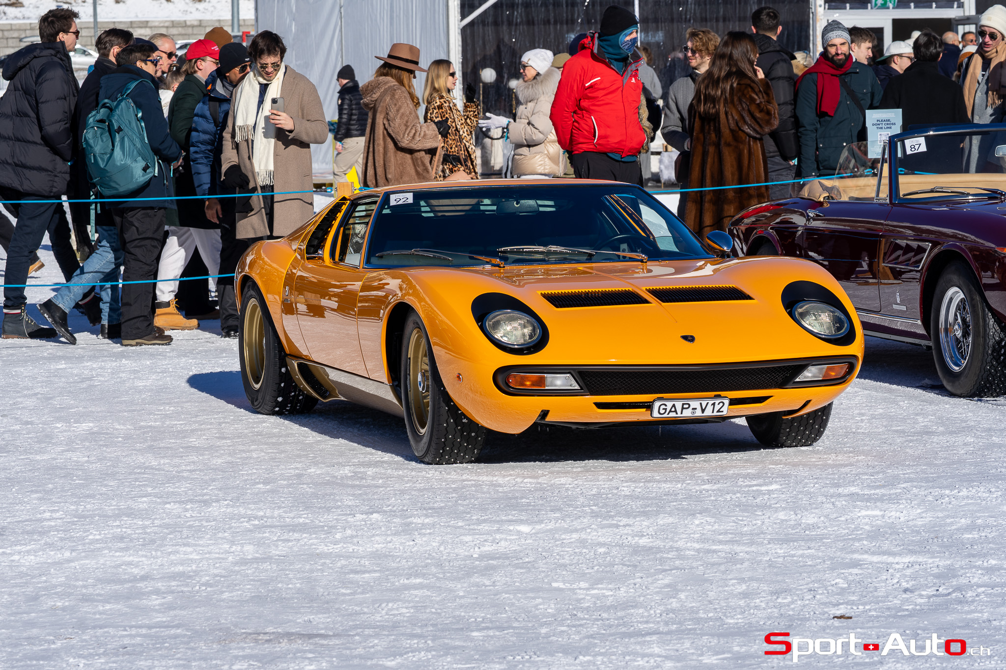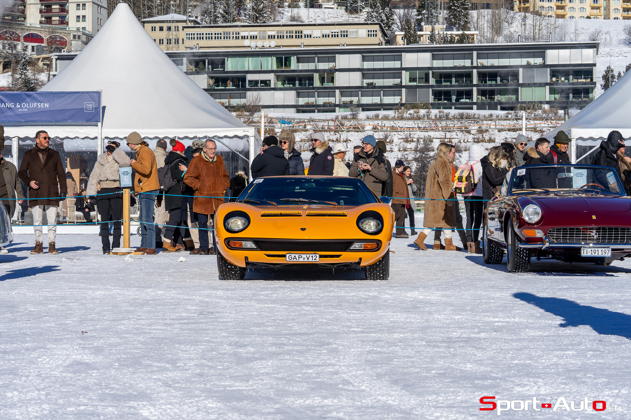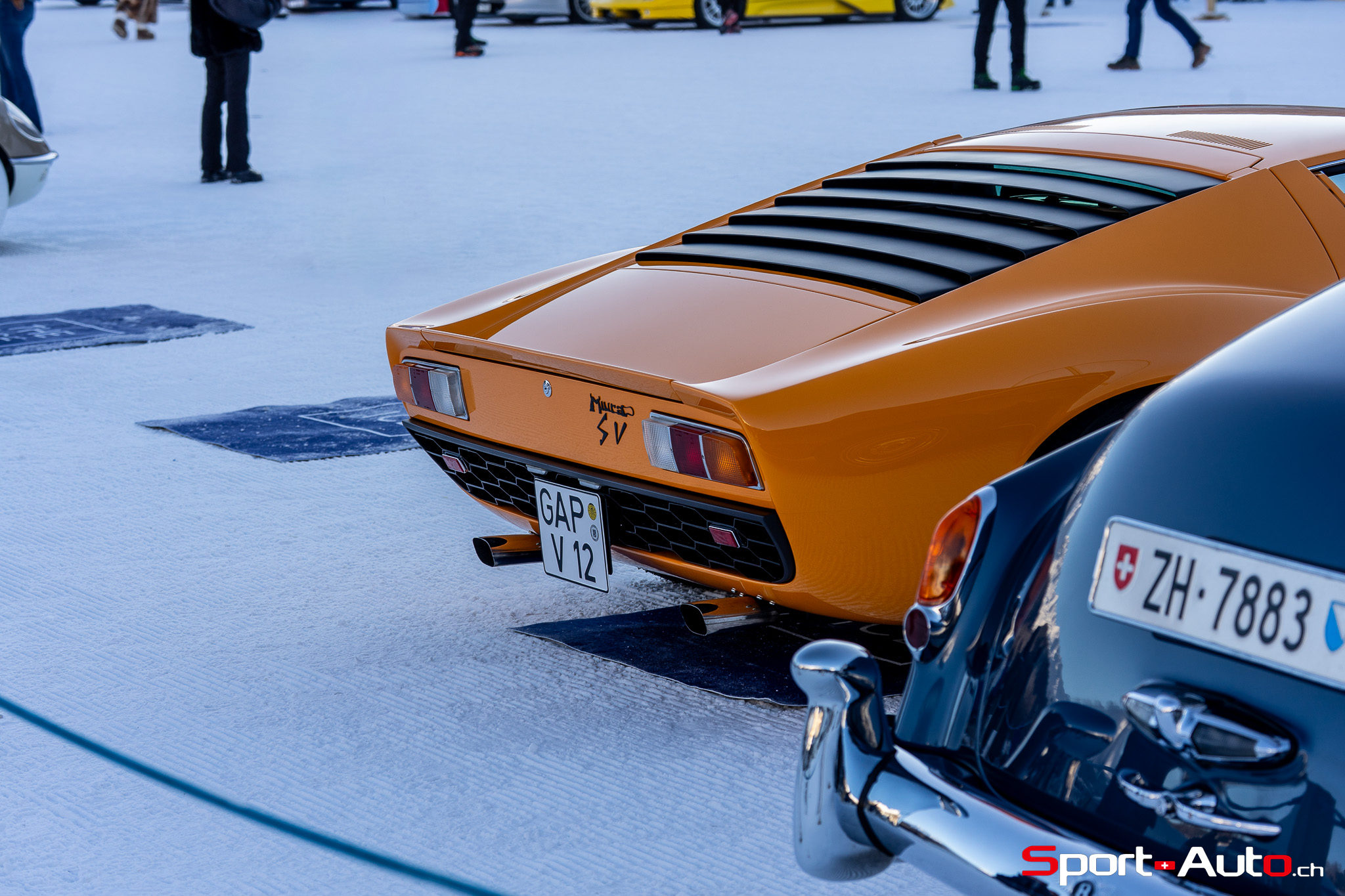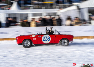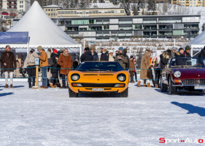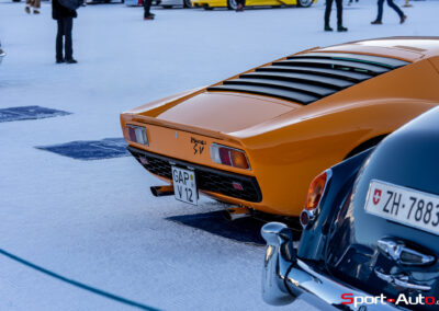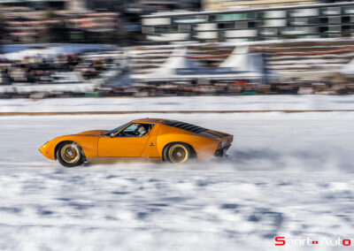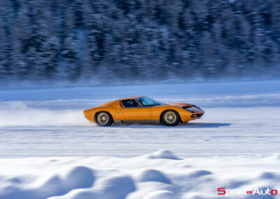 Enfin, une superbe Lamborghini Miura SV de 1972 orange a émerveillé beaucoup de visiteurs sur le lac gelé. Dotée de pneus cloutés, sa silhouette élégante, signée Bertone, était à l’aise sur la piste. Depuis 2022, il est possible de voir à chaque édition au moins un exemplaire de Lamborghini Miura présent au concours d’élégance… et ce n’est pas pour nous déplaire !