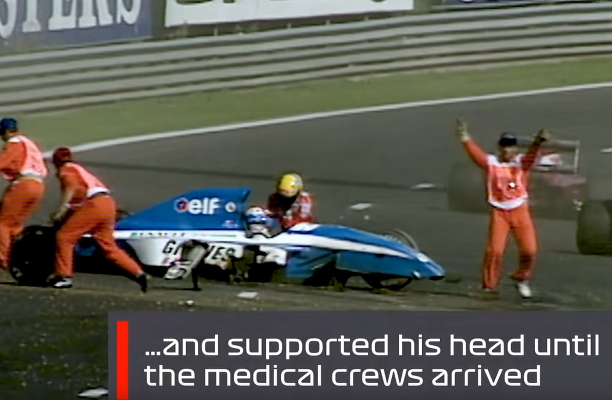 « Les risques d’incendie, voire d’explosion, étaient réels avec les températures extrêmes découlant du régime moteur, les fuites d’huile et l’absence d’eau dans le circuit de refroidissement », poursuit-t-il. « Après avoir actionné le coupe-circuit, Ayrton m’a ensuite redressé ma tête craignant pour ma vie. C’est seulement vingt minutes plus tard, dans le vol en hélicoptère pour l’hôpital, que j’ai repris connaissance. Et le lendemain, lorsque je suis revenu au circuit pour remercier Ayrton, il se faisait encore du souci pour moi. Il avait raison. J’ai dû attendre deux mois avant d’être pleinement rétabli. »