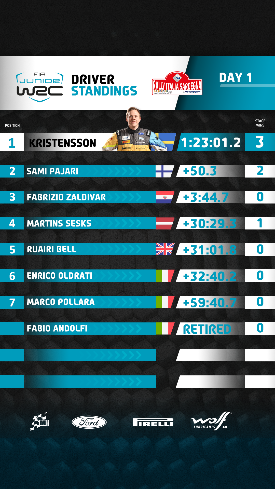 Maciej Woda, FIA Junior WRC Team Director, said: « This has been a very testing opening day for a lot of our crews as Rally Sardinia is proving itself once again to be a rough and difficult rally. Tom delivered an incredible performance on the opening stage this morning and it has to be said he has bounced back from Estonia and handling the pressure really well. There is still quite a long way to go before we can start any congratulations though and I am sure Martins will provide some very interesting stage times tomorrow as he hunts down the stage wins. It’s great to see Fabrizio Zaldivar in the top-three, he came very close to scoring a podium on Rally GB last year so let’s see how he can handle the next couple of days. »