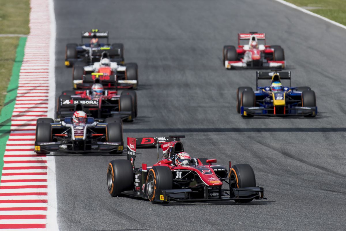 Charles Leclerc has dominated this afternoon’s feature race at the Circuit de Catalunya-Barcelona, winning from pole but having to work hard all race long after a safety car threw everyone’s strategies out the window to win from Luca Ghiotto on the same strategy and Oliver Rowland on the alternate tyre choice.
