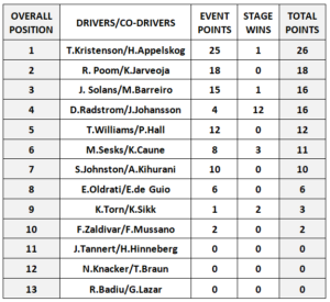 Kristensson inherited the lead from Rådström’s stage 13 exit and took a calm and measured approach after experiencing a tight and competitive fight in section two. Knowing he had a comfortable 1m44.0s lead over Estonian rookie Roland Poom, Kristensson elected for mistake-free finishes over stage wins to deliver his first Junior WRC win.