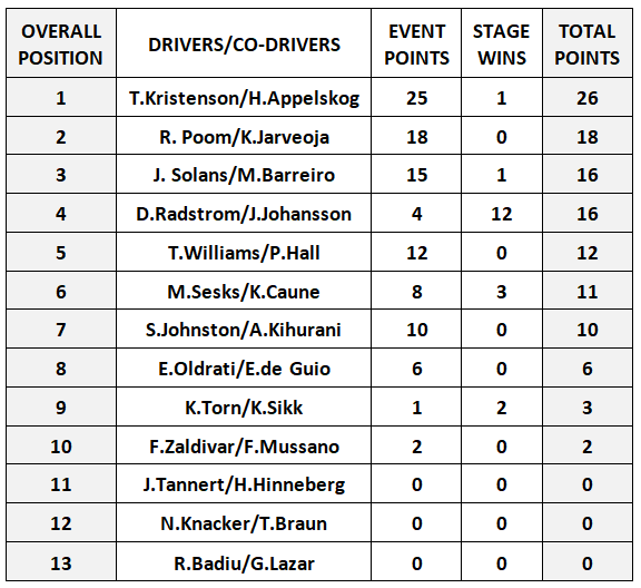 1. Tom Kristensson / Henrik Appelskog 3:14:48.9 « I think we have shown the pace and I am extremely happy about my confidence in myself; I had a plan and I stuck to it. It feels really good and I think it will be a great season. The biggest point for me was not to make any mistakes I think the most important thing was to find the right pace and remain calm. We have enjoyed the rally and of course there were some moments there’s no question about that but in the end it feels great. I’m really looking forward to the rest of the season as I feel I’m really progressing with the car »