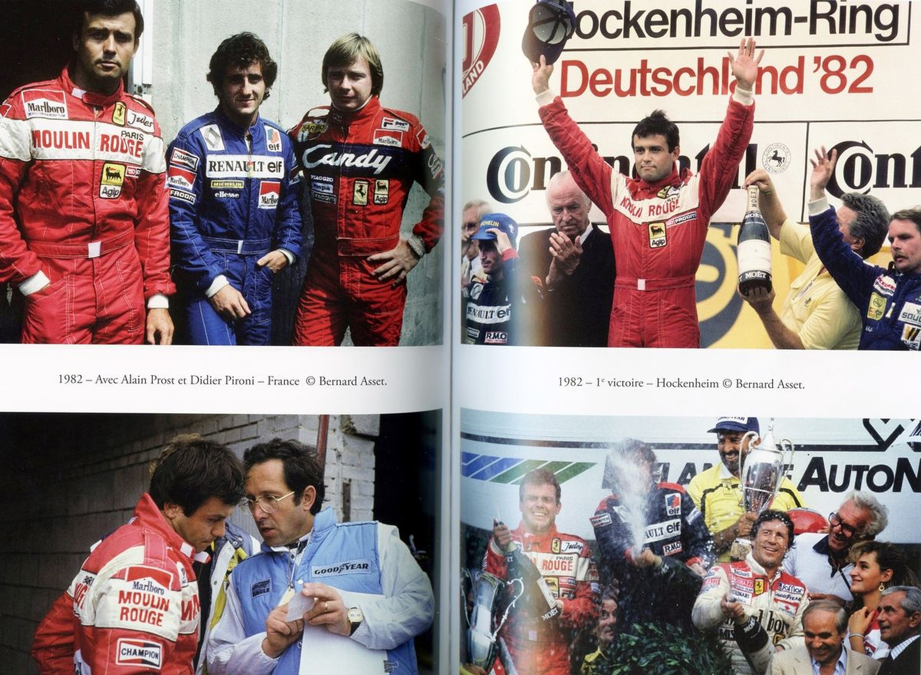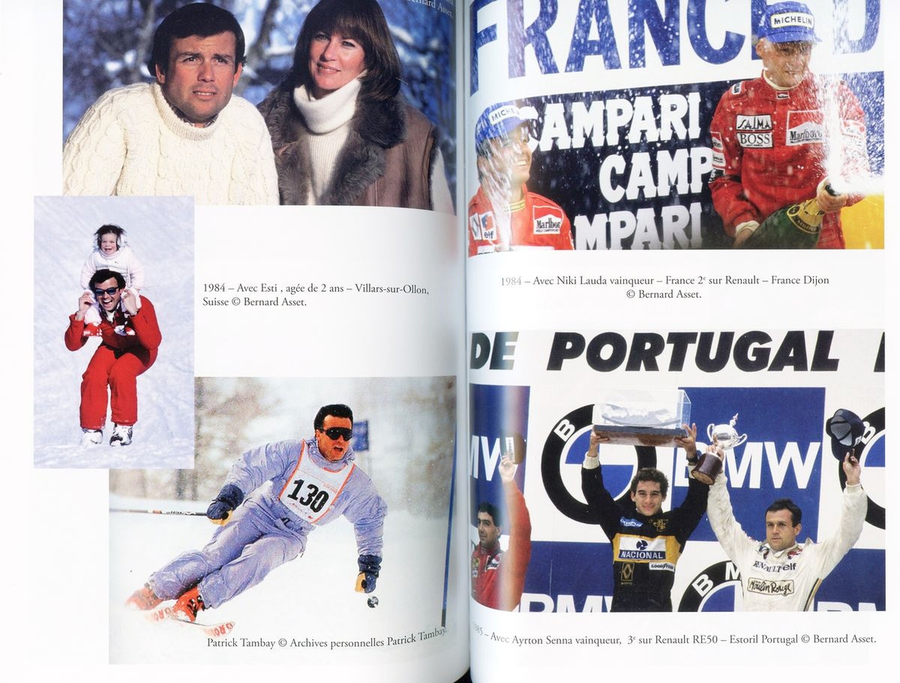 Entre ces deux victoires, celle de Hockenheim en 1982 (ici, au sommet de la page de droite de cette double-page du livre) et celle d’Imola en 1983, José Valli et Olivier Rogar évoquent la vie de Patrick Tambay dans les Alpes vaudoises. Un de ses amis, le célèbre photographe Paul-Henri Cahier l’immortalise au volant d’une Subaru 4×4 à Villars. Le skieur Bernard Russi n’est ainsi pas le seul sportif d’élite à effectuer de la publicité pour les Subaru 4×4 en Suisse.