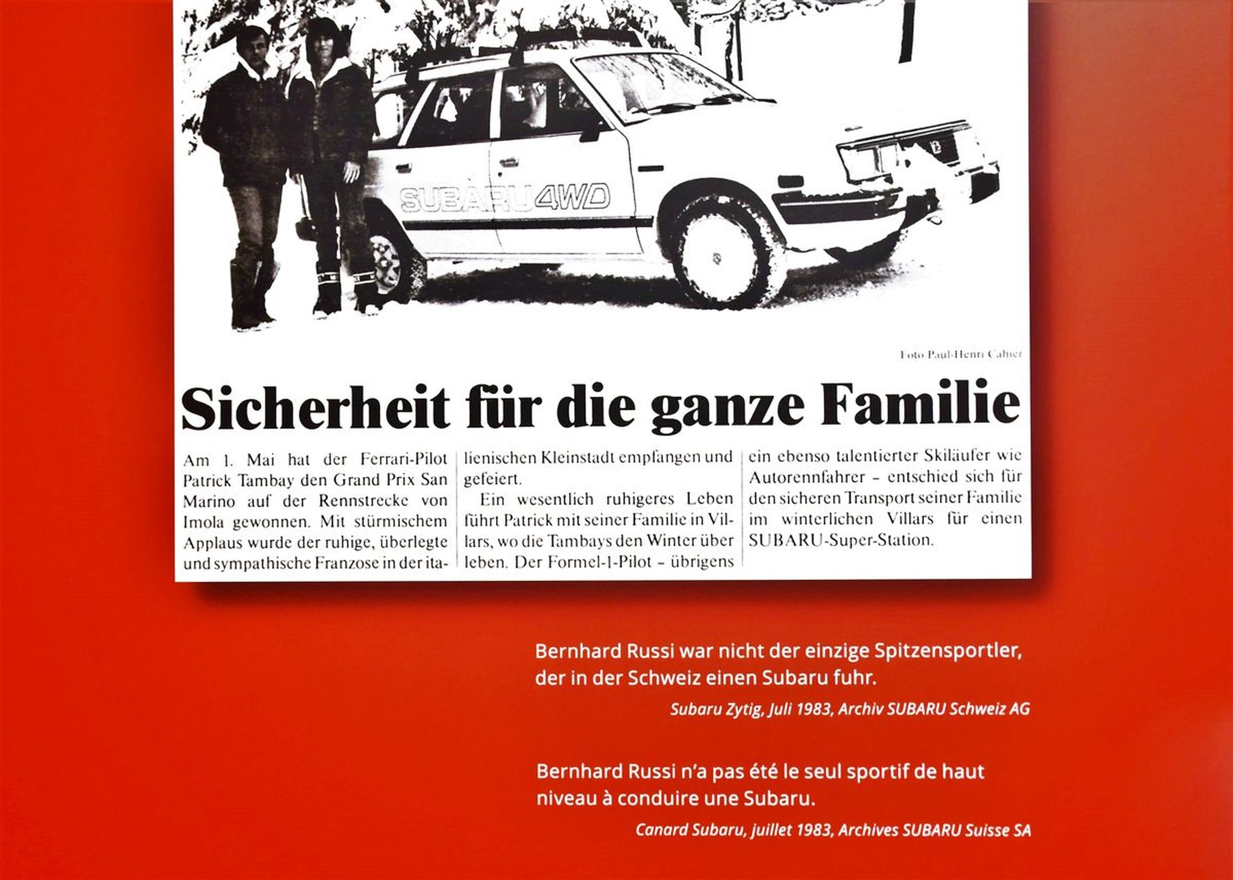 La photo de Patrick Tambay posant avec sa première épouse devant une Subaru 4WD Super Station est ainsi publiée dans le «Subaru Zytig/Canard Subaru». Un agrandissement géant de cette photo de Paul-Henri Cahier est ensuite exposée au Musée Emil Frey de Safenwil, à l’occasion de l’exposition temporaire consacrée aux 40 ans de Subaru en Suisse.