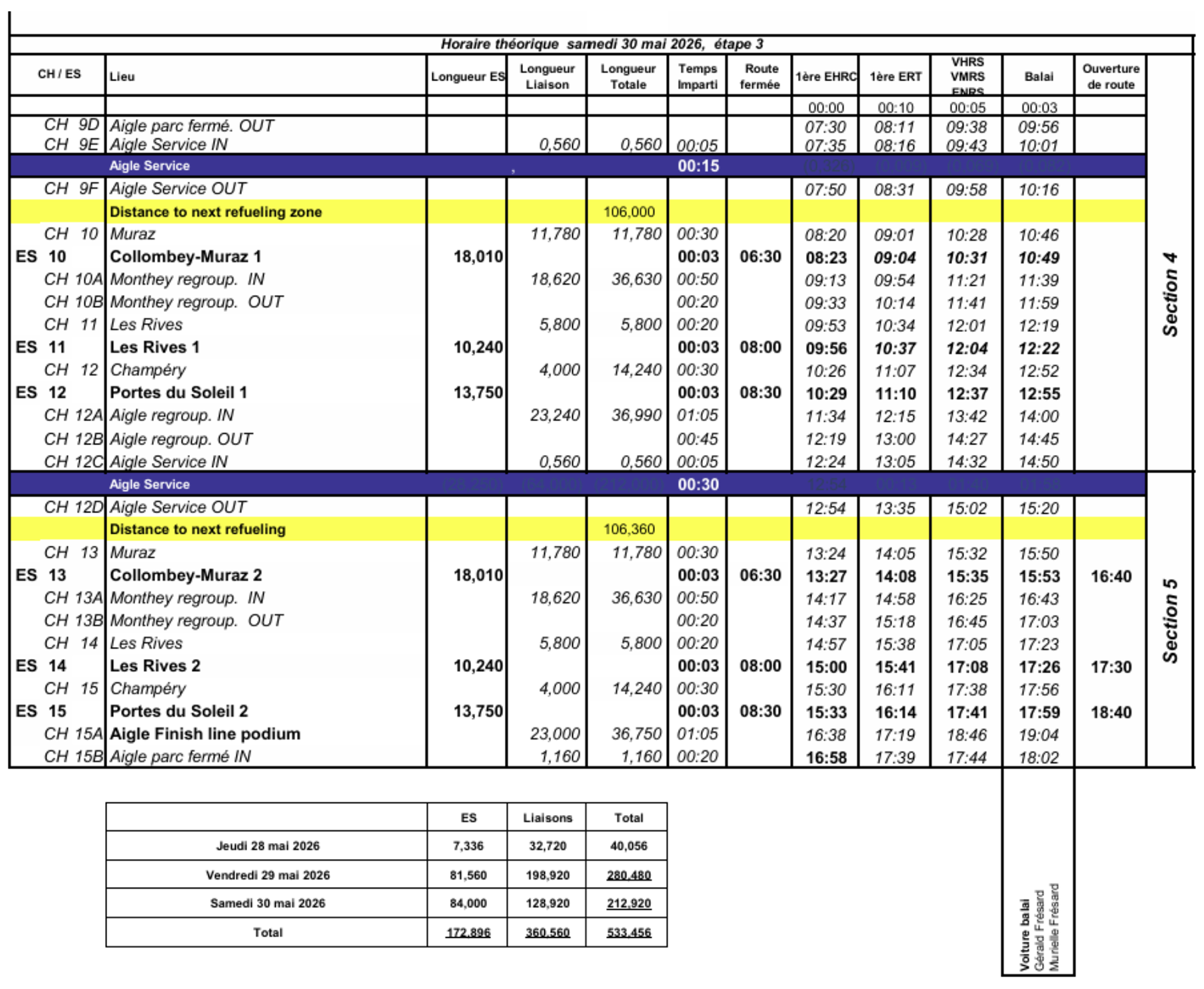 Samedi, on reprend les spéciales du Val d’Illiez dans cet ordre : Collombey-Muraz, Les Rives et Les Portes du Soleil. Après deux passages dans chacune des épreuves chronométrées, les participants se retrouveront pour l’arrivée à Aigle aux alentours de 16h30-17h et le podium final.
