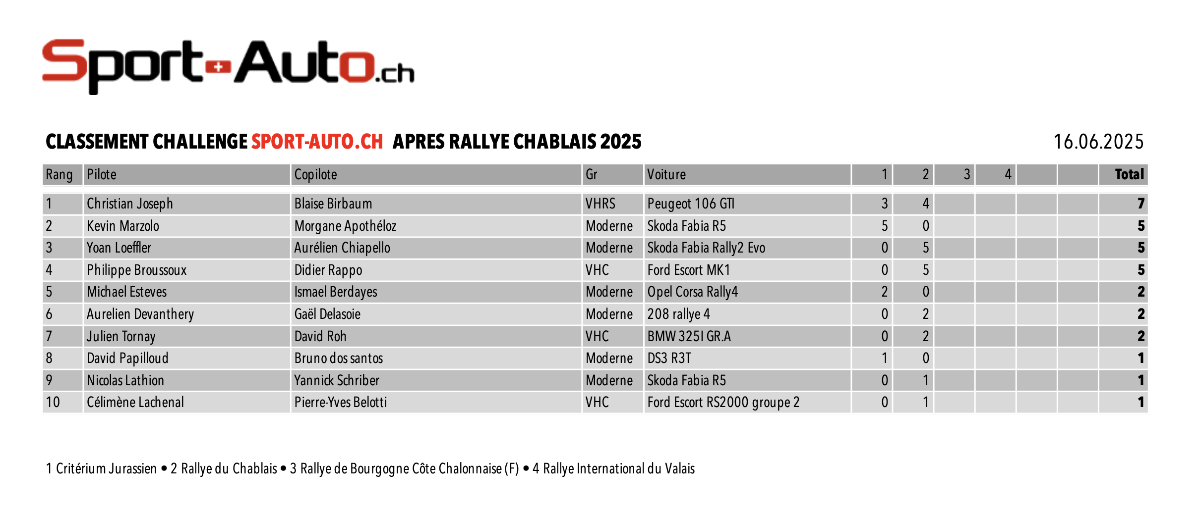 5 au départ, 5 à l’arrivée. Oui, les gens de la régularité sont bizarrement trop fiables pour le Challenge Sport-Auto.ch. Mais on les garde, surtout Christian Joseph – Blaise Birbaum (Peugeot), qui enchaînent une deuxième victoire après leur succès au Crité. Malgré une faible participation (5 équipages), ils engrangent suffisamment de points pour creuser l’écart au classement général.