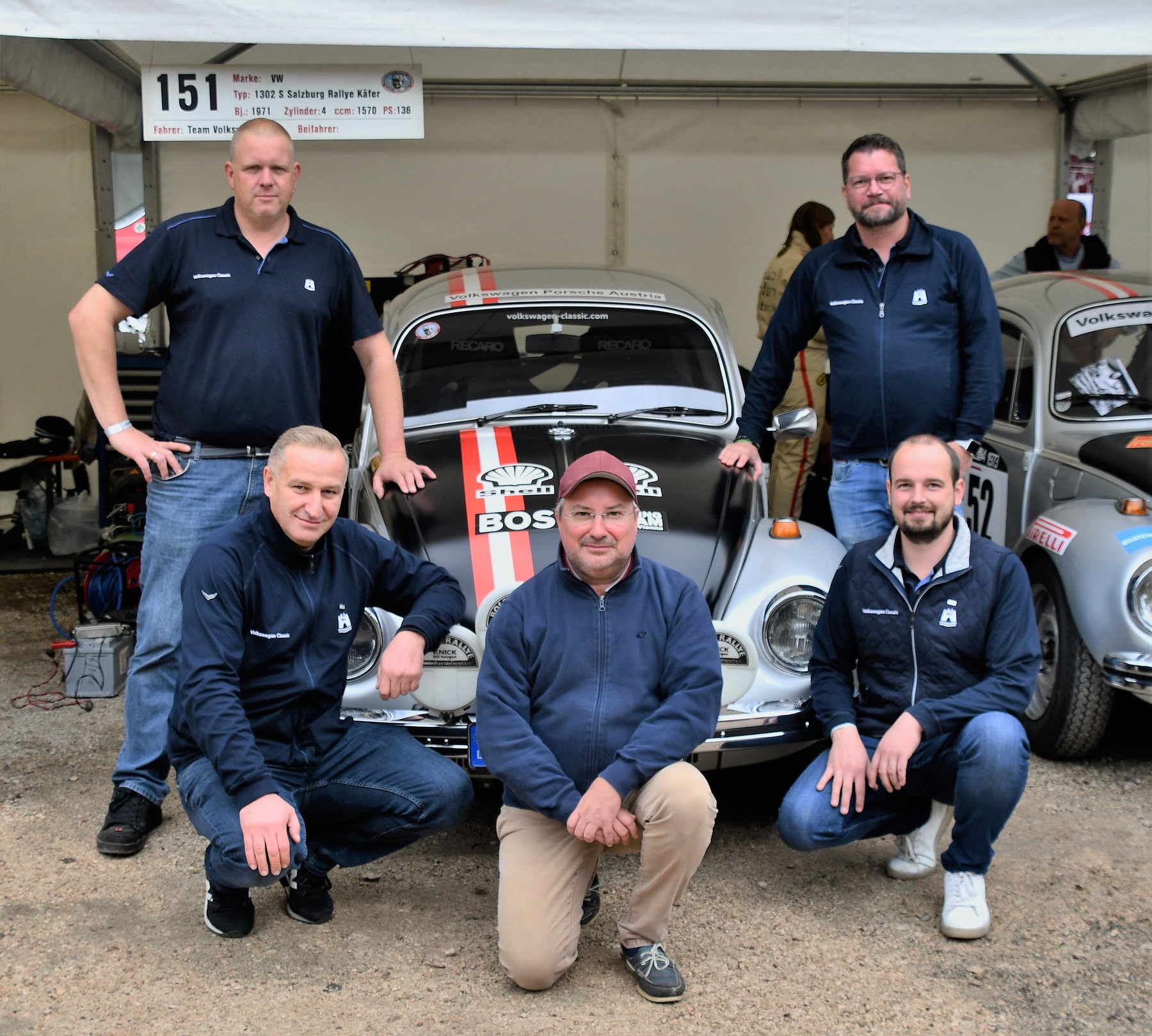 Un accident, heureusement sans gravité, s’est ainsi également produit cette année à Rossfeld, juste avant le dernier virage en épingle du parcours. J’ai ainsi été très content d’avoir pu ramener sans aucune égratignure chacune des trois voitures de course que m’avaient confiées les responsables de Volkswagen Classic. J’adresse ici mes plus vifs remerciements à Sascha Neumann, à la tête de Volkswagen Classic depuis 2015, pour la confiance témoignée. Je remercie également toute l’équipe qu’il avait déléguée à Berchtesgaden, à savoir Steffen Weise (à g.) et Michael Winkler, tous deux debout sur la photo ci-dessous, ainsi que Ceyhan Erdogan (à g.) et Marcel Leifer, accroupis.